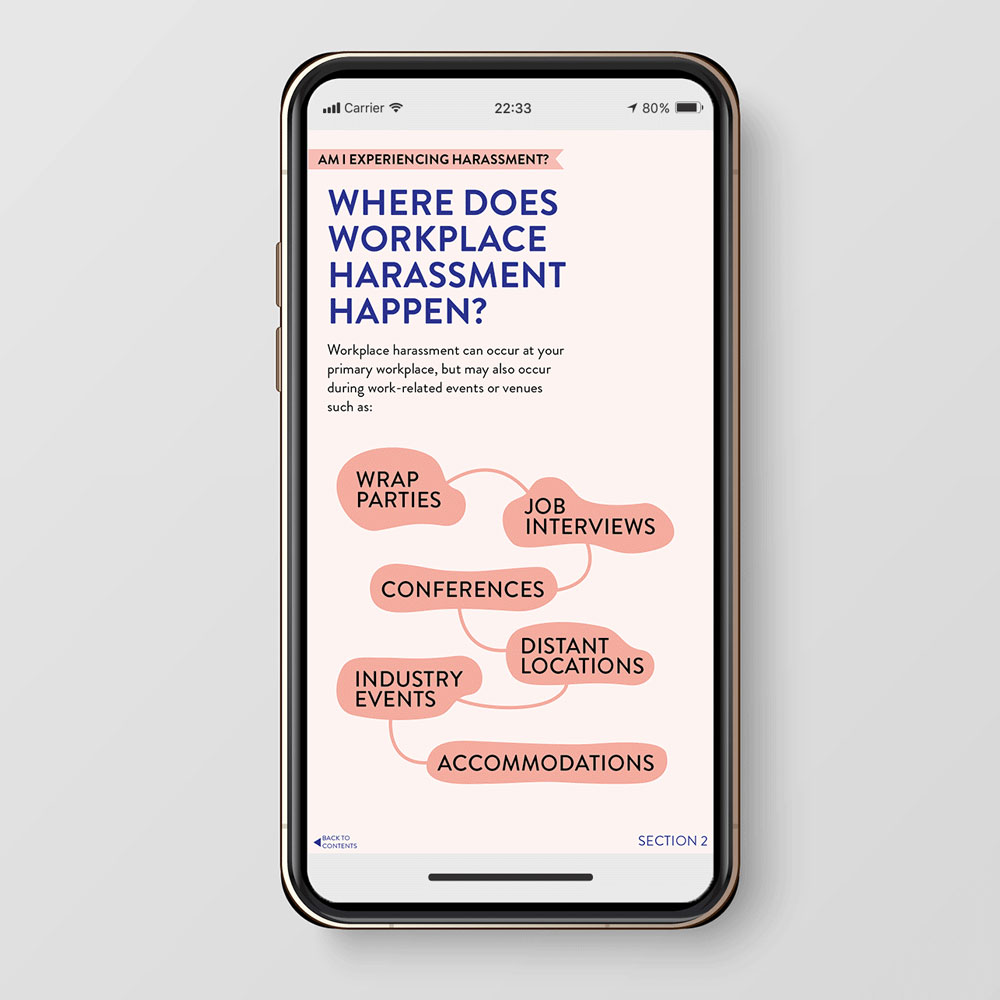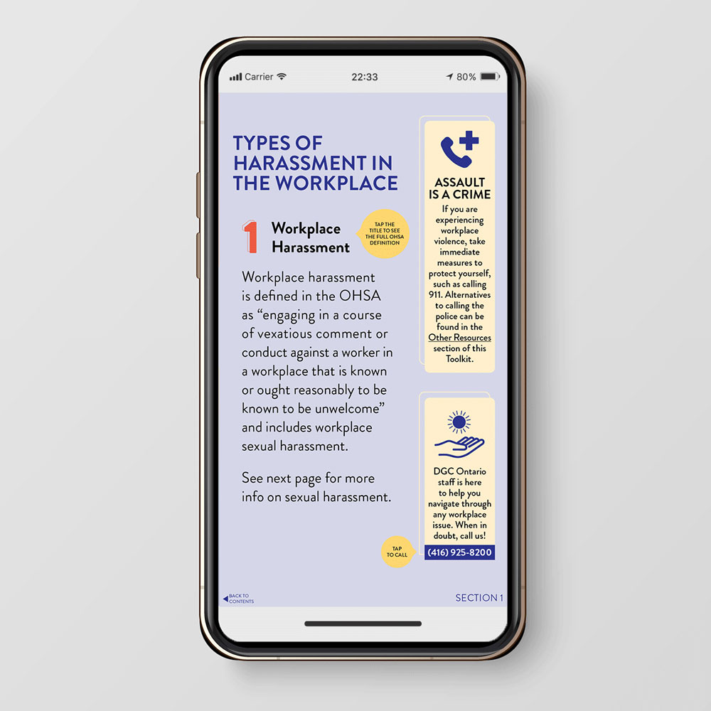 The Directors Guild of Canada — Ontario needed to build a confidential document for their members experiencing harassment in the workplace. We worked to create an interactive PDF that members can carry where ever they go. Important information is communicated with calming and clear UX design.